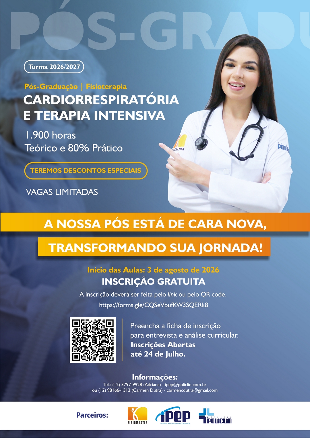 Formato do curso: Segunda a sexta feira (07h - 13h ou 13h - 19h), 01 final de semana de plantão 12h (sábado e domingo) e aula teórica mensal com professores e mestres renomados.
